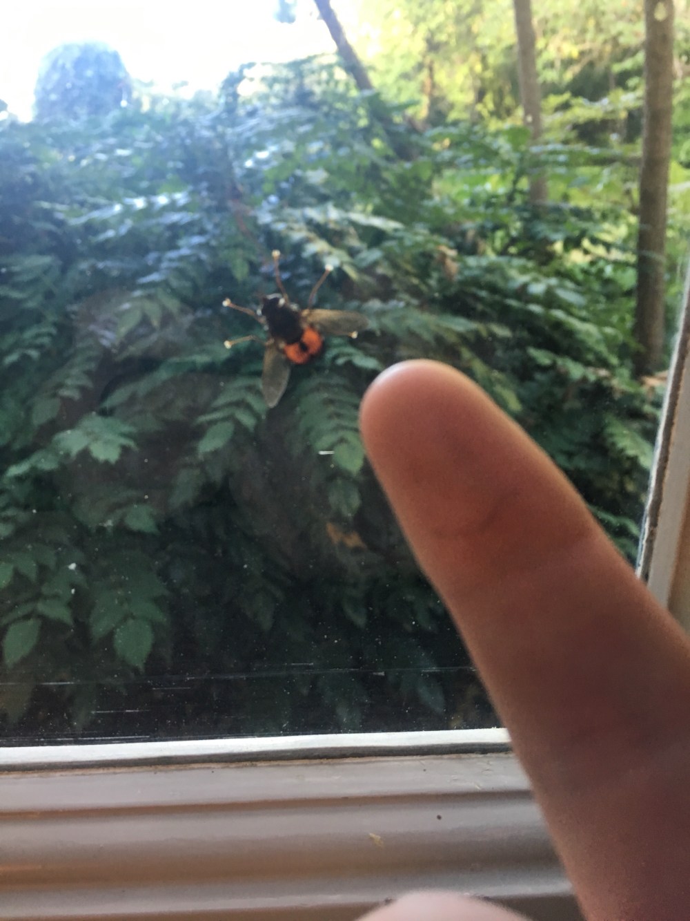 An insect is something defined by being a small arthropod with one or two sets of wings and 6 legs. This little guy was stuck in a window and had a very neat orange color to him, the smiley on my finger is faded but it’s still there.